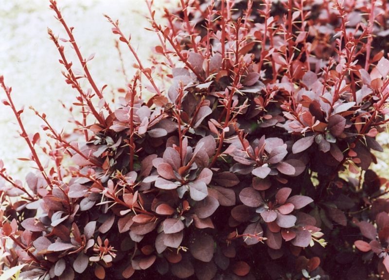 Саженцы кустарника барбарис Кармен (Carmen) – представляют собой необыкновенный впечатляющий своим внешним видом сорт. Его листва отличается насыщенно ярко-красным цветом, что позволяет кардинально поменять любую композицию в ландшафте. Побеги растения темно-коричневого цвета, они дугообразно отклоняются в сторону. Листья округлой формы, а цветение происходит в мае. Цветы на кустарнике желтые, собранные в соцветия-кисти диаметром 1 см. Из цветов впоследствии вырастают ягоды красного цвета, продолговатые до 1 см в длину. Созревают они ближе к октябрю. Сорт Кармен может приживаться в любой почве, но любит обилие солнечного цвета, а в тени утрачивает уникальный цвет листьев, которые сразу же зеленеют.