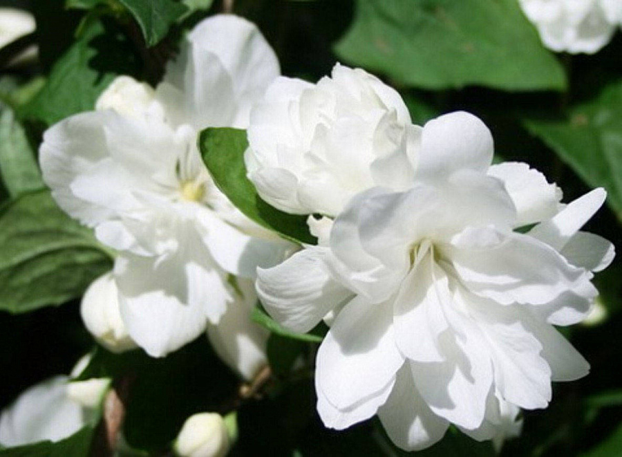 Саженцы чубушника гибридного Виргинал (Virginal) представляют собой сложный гибрид из нескольких видов кустарника. Отличается широким раскидистым кустом с сочно-зелеными листьями, который в высоту может достигать 2,5 м. Соцветия у этого кустарника очень красивые и изящные. На одной веточке собрано несколько белоснежных махровых цветков в окружении темной листвы. Аромата практически не имеет. Крупномер чубушника гибридного Виргинал способен за пару лет достигнуть размеров взрослого растения. Появление безупречных соцветий можно наблюдать с конца июня и до середины июля.