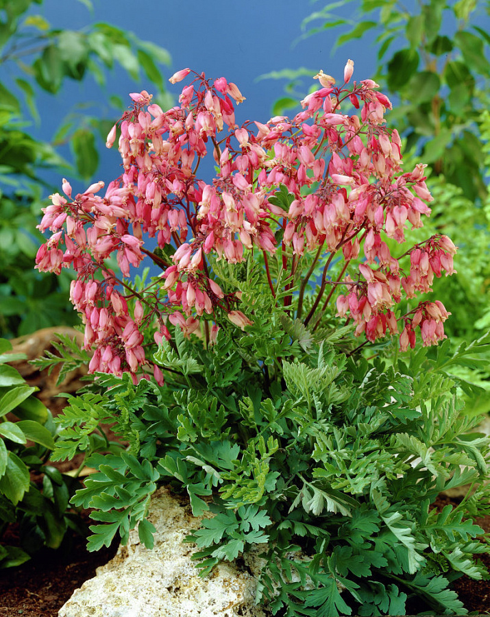 Рассада Дицентры изящной Bacchanal (Бэкканал) почти не поражается вредителями и болезнями из-за содержащихся в растении алкалоидов. Является многолетним корневищным оригинальным цветком. Растет кустом с прикорневыми зелеными резными папоротниковыми листьями. Цветки формируются на дугообразных роговых стеблях, необычной формы и расцветки. Похожи на раздвоенные розовые сердца с яркой белой «слезкой» - семенами внутри. Растения-партнеры в цветнике: