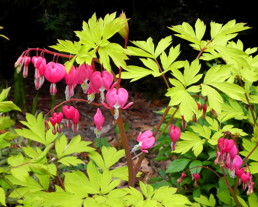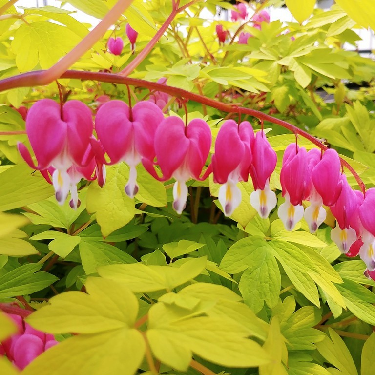 Рассада Дицентры великолепной Gold Heart (Голд Харт) усеяна ажурными желто-зелеными листьями. Формирует среднего размера куст высотой до 100 см. Растение зимостойкое, однако чувствительно к солнечным ожогам. Украсит любой весенний цветник необыкновенным сочетанием золотистых листьев с яркими дорожками элегантных розовых сердцеподобных цветков, подрагивающих от ветерка. Цветет около месяца в конце весны, затем вся наземная зеленая масса отмирает. Семена используют при выведении нового сорта. Преимущества:
