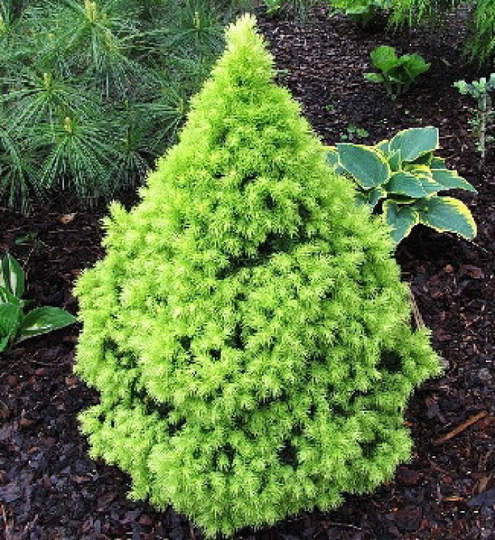 Саженцы Ели канадской Коника Майголд (Conica Maigold) – является хвойным деревом с декоративной формой конуса. Вырастает в высоту до 100-300 сантиметров и диаметром 120 сантиметров. Молодое растение с золотисто-желтой хвоей, которое со временем обретает темно-зеленый окрас. Хвоя вырастает до 5-10 миллиметров. Ель канадской Коника Майголд имеет плоды в виде продолговатых коричневых шишек. Дерево считается морозоустойчивым. Молодое растение предпочитает полутень, может пострадать от весенних ожогов. Взрослое растение растет на солнце. Предпочтительна влажная, суглинистая почва. Прекрасно озеленяет террасы.