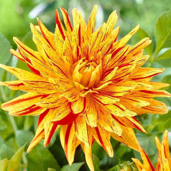 Георгина бахромчатая вайнсом - это воплощение изысканности и красоты в вашем саду. Ее стебель прочный, достигает высоты до 100 см, а листья имеют уникальную форму, придающую растению особый шарм. Цветки желтого цвета с ярко-красными штрихами радуют глаз в течение нескольких месяцев в году - с марта по июль.