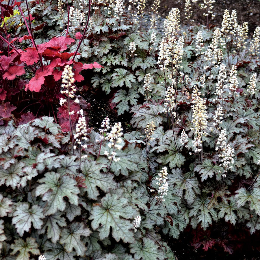 Рассада гейхереллы Кракед Айс (Chacked Ice) выглядит очень эффектно благодаря темным прожилкам, контрастно проступающим по синевато-зеленой поверхности листвы. Во второй половине лета и без того привлекательный вид дополняется цветоносами с мелкими розовыми цветочками. Этот сорт прекрасно сочетается с геранями, лилейниками и астибальдой.