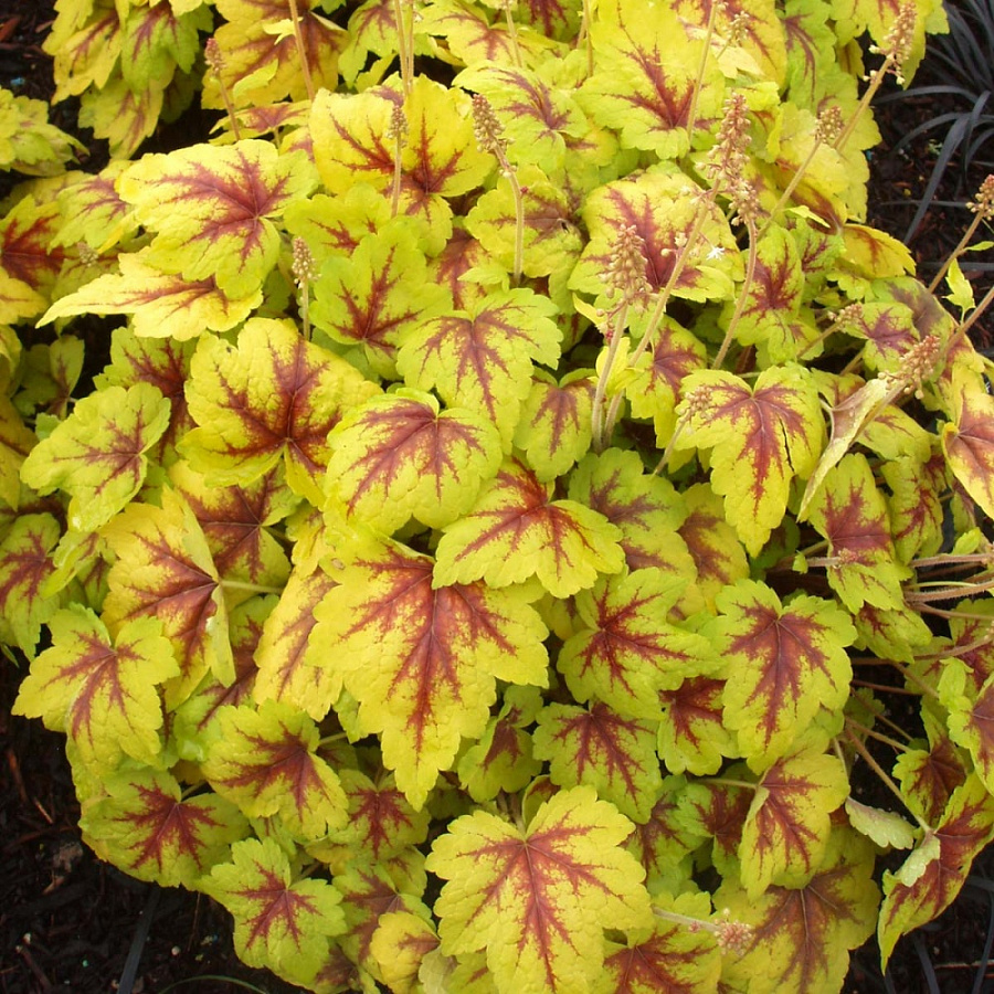 Рассада гейхереллы Стоплайт (Stoplight) – это синтез гейхеры и тиареллы, сочетающий в себе самые лучшие черты обоих сортов – форму листьев и их цвет. Резкий контраст цветов – от красного в середине, до бледно-жёлтого и зелёного на самых кончиках листьев. Из-за трехцветия сорт и был прозван «Светофор». Растения быстро и довольно удобно культивировать. После проращивания семян, рассада может прекрасно адаптироваться практически в любых условиях. Особенности сорта Стоплайт: