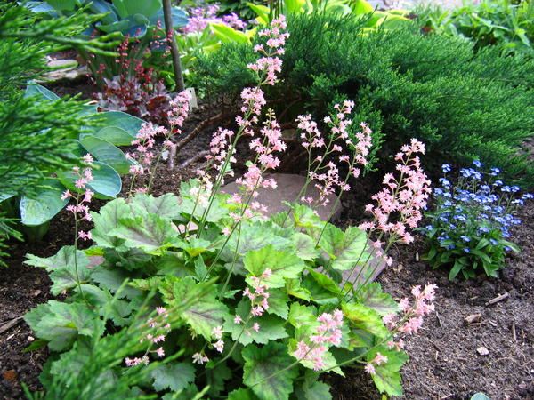 Рассада гейхереллы Розали (Rosalie) украсит ваш сад красивыми зелеными листьями, на поверхности которой проступают бордово-коричневые прожилки. В конце весны розетка выпускает высокие соцветия с нежными розовыми цветочками. Этот сорт отлично сочетается с другими декоративными растениями. Простая в уходе рассада гейхереллы Розали (Rosalie) хорошо приживается на плодородной почве. Уход за ней заключается в простых действиях: полив по мере высыхания земли, мульчирование поверхности почвы и внесение подкормок. Многолетник не нуждается в укрытии, роль которого выполняет листва.