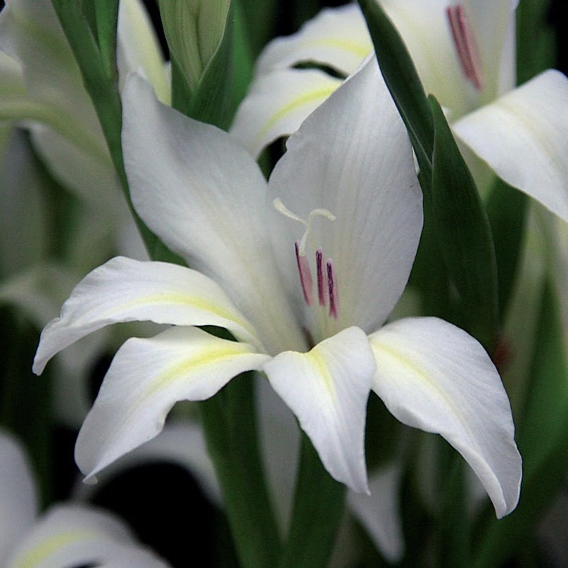 Луковицы гладиолуса гибридного Albus подходят для создания бордюров, альпинариев и цветников. Растения могут быть посажены в горшки на балконе или террасе. Лучше всего они растут в почве с богатым содержанием гумуса, на солнечных местах, защищенных от ветра. Сорт отличается небольшими размерами. Высота цветоносов варьируется от 45 до 60 см. Цветки воронковидной формы, напоминают лилии, собраны в одностороннее колосовидное соцветие. Лепестки белоснежные с небольшим желтоватым оттенком. Во время цветения от гладиолуса гибридного Albus исходит приятный аромат.