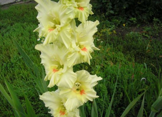 Луковицы гладиолуса гибридного Bridget сажают весной в ряды или группами на солнечное место на расстоянии 25-35 см в глубокие лунки. Высота взрослого растения вместе с соцветиями составляет от 100 до 150 сантиметров. Стебель вертикальный, не ветвящийся. Листья длинные, линейные, насыщенно-зеленые. Лепестки цветков сильно волнистые, светлого желто-зеленого окраса, не выгорают на солнце. У каждого бутона шесть красиво изогнутых наружу лепестков. Диаметр цветков до 15 сантиметров. Соцветие гладиолуса гибридного Bridget пышное, колосовидное, на нем может распуститься до 10 цветков.