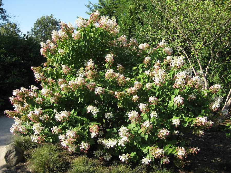 Саженцы гортензии метельчатой Ангел Блаш (Angels Blush) вырастают до 2,5-3 метров в высоту. Побеги эффектного кустарника растут строго вверх. Отличается крупномер своей выносливостью: