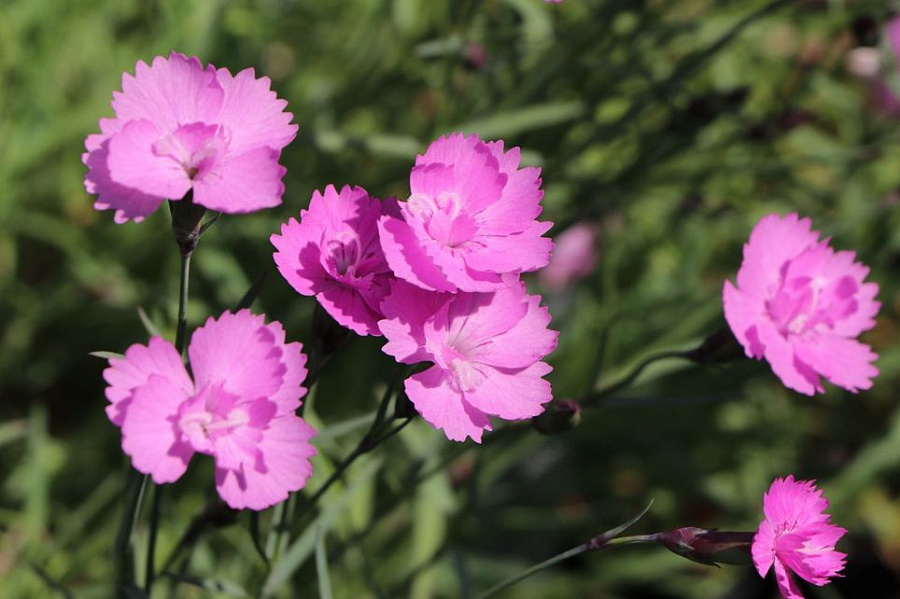 Саженцы гвоздики гратианополитанской (серо-голубой) Еэдангери (Diantus gratianopolitanus Eydangeri) – декоративный сорт с обильным ярко-розовым цветением и характерной сорту сизой листвой. Пышный куст вырастает до 30 сантиметров. Листочки тонкие, плотные, длинные – до 15-18 сантиметров в длину. Цветение продолжительное – с июня по конец октября. Цветочки – ярко-розовые, полумахровые, около 3 сантиметров в диаметре. Обладают ярким ароматом. Растение – морозостойкое, но на зимний период требует укрытия, так как корневище залегает в почву на 10-15 сантиметров. Защитный материал снимают только при наступлении устойчивого тепла, без ночных весенних заморозков.