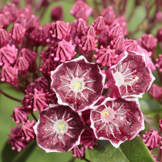 Кальмия широколистная кипсейк - это удивительное растение, которое поразит вас своей красотой и изяществом. Ее ствол прочный и прямой, а размеры достигают высоты до 150 см и диаметра до 130 см. Листья имеют форму овала и создают неповторимый облик растения. Цветки кальмии широколистной кипсейк окрашены в фиолетово-бордовые тона с белой каймой по краю, что придает им особую изысканность.
