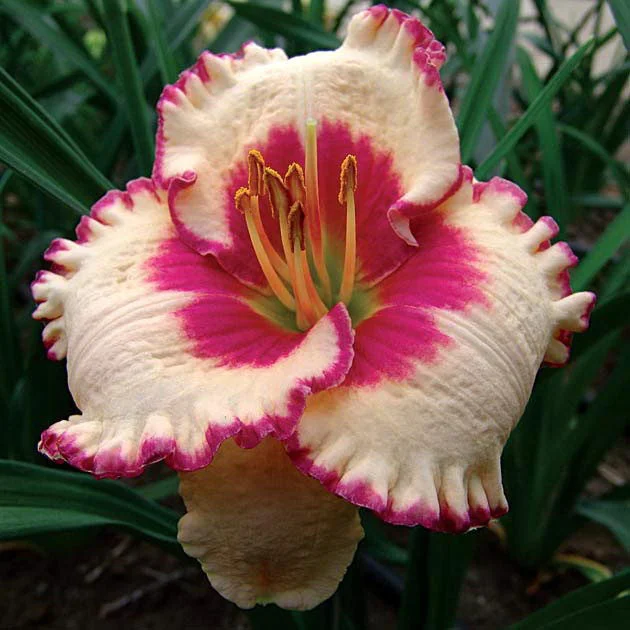 Окраска цветка : кремово-жёлтый с красной окантовкой и глазком, горло зелёное