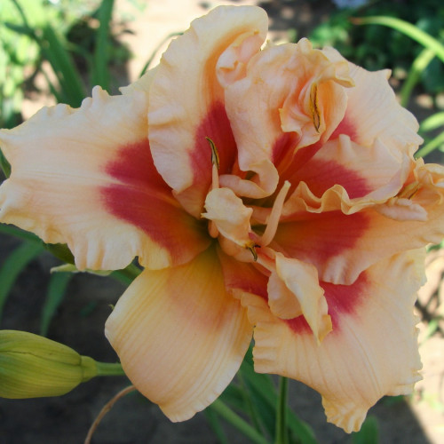 Цветущий лилейник Фоти Секонд Стрит представляет собой завораживающее зрелище. Лепестки имеют нежно-кремовый оттенок с розовой серединкой и зеленым горлышком. Вокруг горла можно наблюдать яркое желтое кольцо. Края внутренних лепестков сильно гофрированные, что придает бутону полноту.