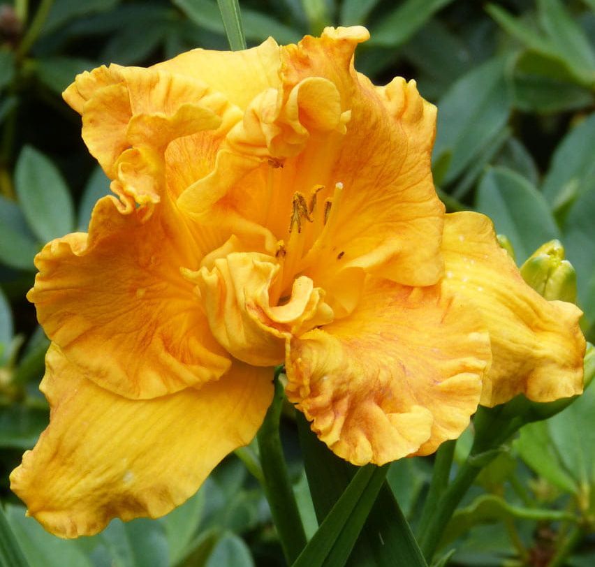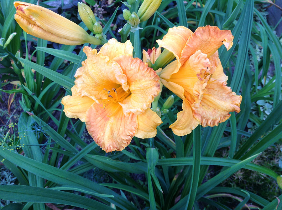 Рассада лилейника Оранж Нассау (Orange Nassau) дает возможность украсить свой палисадник сказочно красивыми цветами насыщенных оттенков. Растение цветет довольно рано, крупными бутонами персико-оранжевого цвета с огромным золотистым глазком и лимонным горлышком. Поверхность лепестков немного смятая, а их края сильно гофрированные.