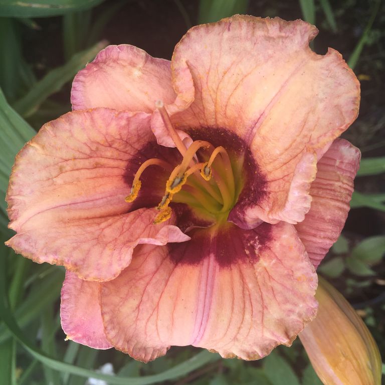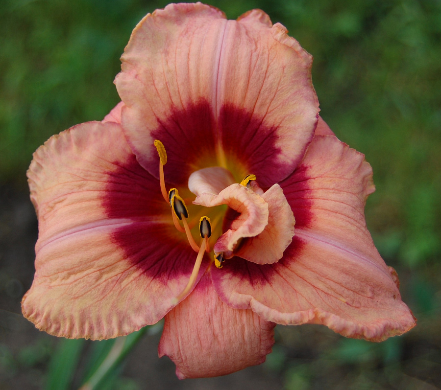 Окраска цветка : лососевый с пурпурным глазком и зелёным горлом