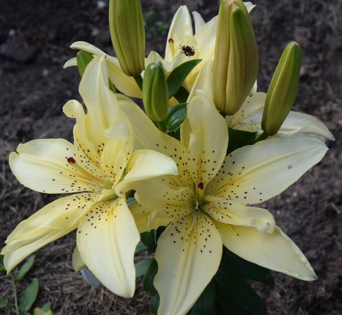 Луковицы азиатской горшечной лилии Маунтин Джой (Lilium asiatic Mountin Joy) относятся к неприхотливым миниатюрным сортам. Высота стеблей до 40 см. Цветки крупные, в диаметре около 15 см. Окраска желто-ванильная, более насыщенная в центре и светлее по краям. Крап темно-бордовый, контрастный. Центральные лепестки узкие, вертикально направленные. Лилии хорошо растут на освещенных участках или в полутени. Предпочитают рыхлые, дренированные, удобренные участки. Откликаются на органические и минеральные подкормки. В период бутонизации важно своевременно поливать растение, но не переувлажнять.
