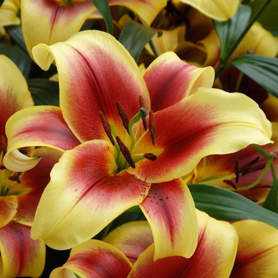 Лилия от-гибрид Флавия - это великолепное растение с яркими желтыми цветками, украшенными насыщенно-винным пятном. Ее высота может достигать до 120 см, а размер цветка поражает своей красотой - до 25 см в диаметре. Листья лилии имеют зеленую окраску и интересную форму, что делает растение еще более привлекательным.