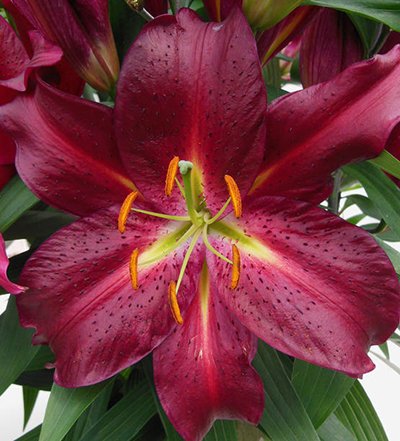 Лилия восточная "Коммитмент" - это великолепное растение, которое поразит вас своей красотой и изысканностью. Ее стебель достигает высоты до 100-120 см, а цветки красного цвета с темным крапом радуют глаз в течение 4-6 недель. Листья зеленого цвета имеют интересную форму, что делает лилию еще более привлекательной.