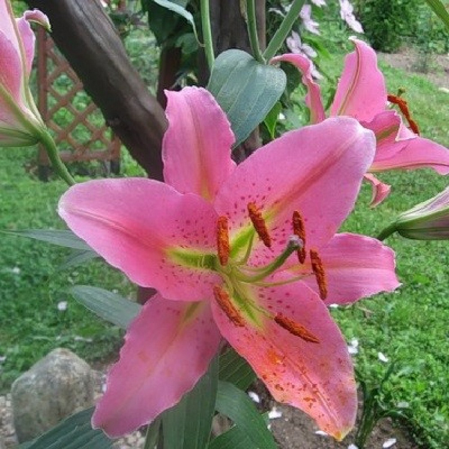 Саженцы и рассада восточной лилии Медуза (Lilium oriental Medusa) отличаются неприхотливостью в выращивании, высокими декоративными качествами. Благодаря пестрому окрасу растение сразу выделяется на клумбе. Цветки крупные, насыщенного розового цвета, с желто-зеленым горлышком и пурпурным крапом.