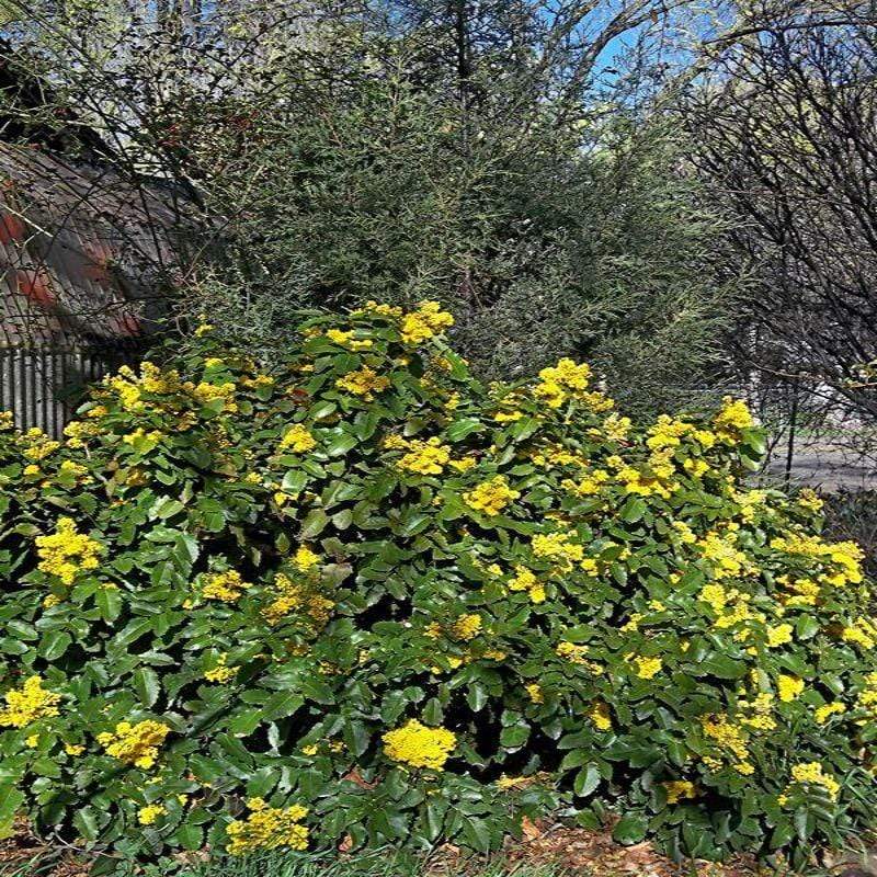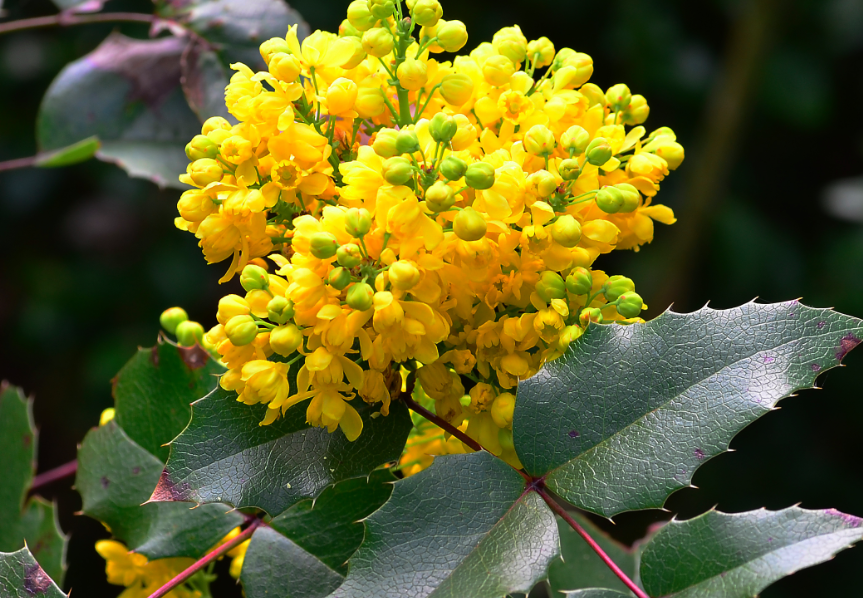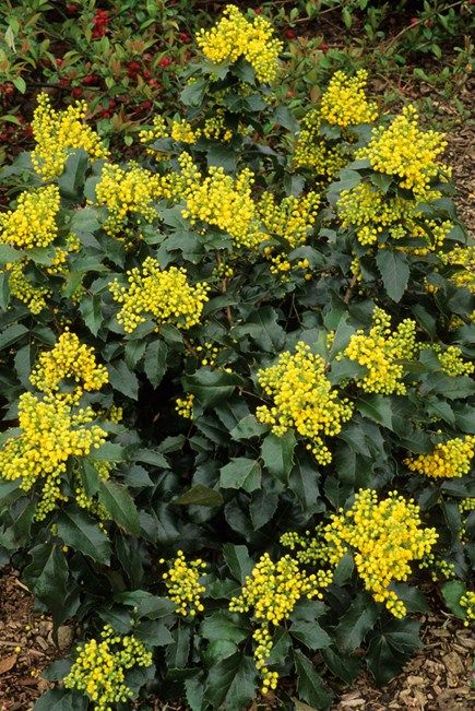 Саженцы магонии падуболистной относятся к тем вечнозеленым кустарникам, которые могут прятаться под покровом снега, и уже с первой оттепелью радовать появлением зелени. Листья у кустарника плотные и кожистые, темно-зеленого цвета. В конце мая появляются пышные соцветия желтых цветков.