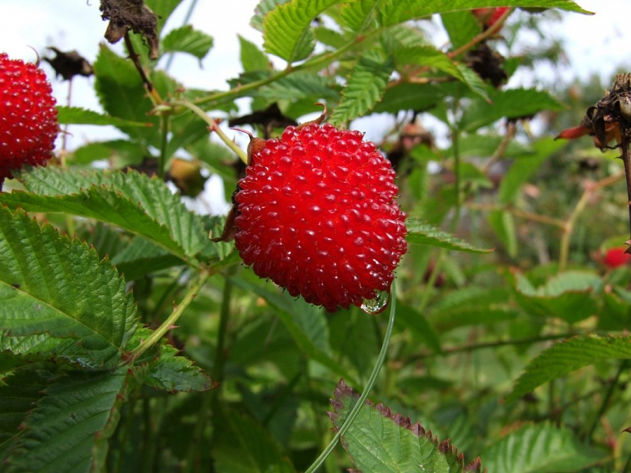 Саженцы малины розолистной (Rubus Illecebrosus) высаживают в дренированный плодородный грунт на солнечном участке сада. Взрослый куст достигает 90-100 сантиметров в высоту. Весной распускается белыми цветами, а летом активно плодоносит. Характеризуется высокой декоративностью. Гофрированные листья и ярко-бордовые ягоды, размером до 3 сантиметров, станут украшением участка. Плоды отдаленно напоминают клубнику, но на малину все-же похожи больше. Цветы распускаются одновременно с созревающими ягодами, которые всегда предпочитают «смотреть» вверх, не скрываясь под листвой.