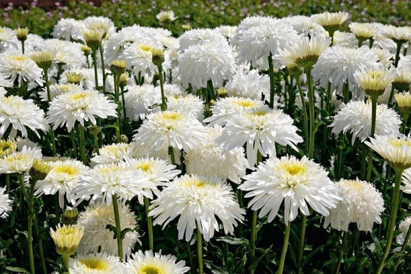 Рассада нивяника наибольшего Фиона Гохилл (Fiona Goghill) прекрасно смотрится в групповых посадках с другими растения такой же высоты и периода цветения. Цветки у этого растения густомахровые на прочных, но тонких стеблях. Именно поэтому их часто используются для срезки в подарочные букеты. Тонкие вытянутые лепестки белые, с кремово-желтой серединкой.