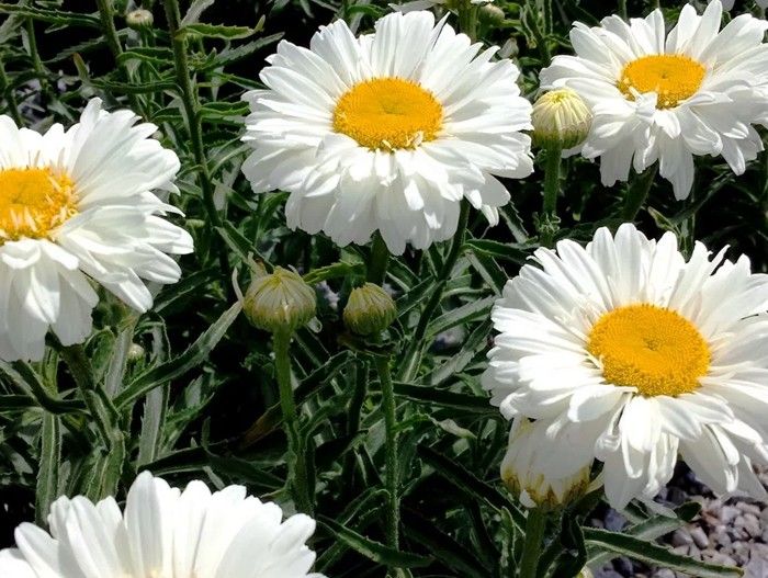 Редкий немахровый или полумахровый сорт нивяников, при этом он очень декоративен. Желтый центр окружен несколькими слоями белых лепестков. Высота растения достигает 70 см, делая его заметным в групповой посадке.