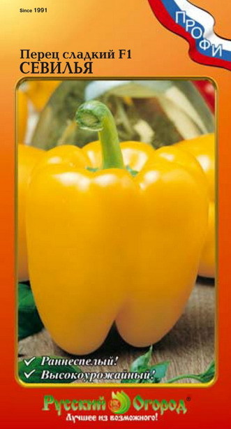 'Семена перца Севилья F1 порадуют опытных и начинающих садоводов отличной всхожестью и высокой урожайностью. Этот сорт является раннеспелым, это значит, что уже через 90 дней после появления ростков, можно будет собирать крупные плоды. Их желтая мякоть обладает приятным вкусом, содержит много сока и полезных веществ. Овощ можно употреблять в сыром виде, подвергать кулинарной обработке и консервировать на зиму.