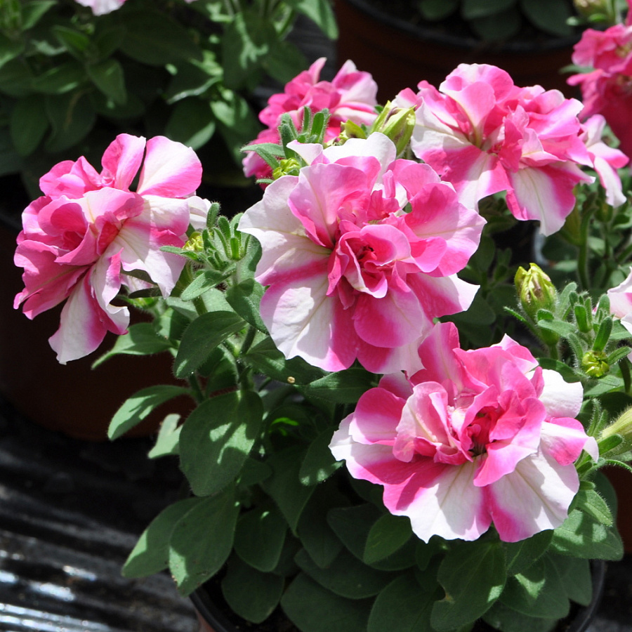 Петуния махровая многоцветковая дуо роуз энд вайт - это настоящее воплощение нежности и изысканности в вашем саду. Ее стебли, достигающие высоты до 35 см, украшены крупными махровыми цветками диаметром до 6 см, окрашенными в розово-белую гамму. Листья петунии имеют ярко-зеленый оттенок, что создает прекрасный контраст с цветами.