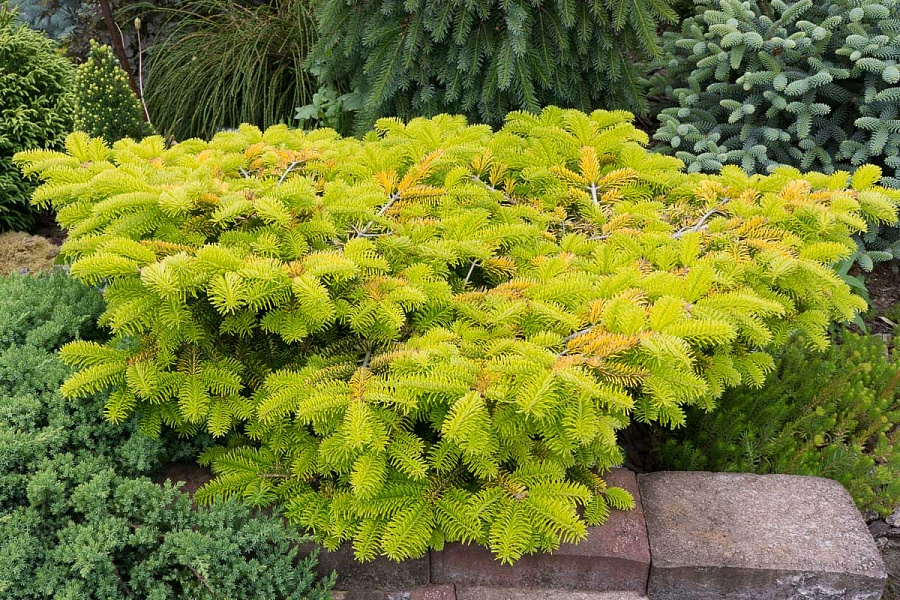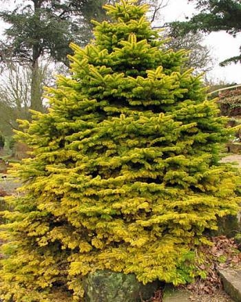 Саженцы Пихты нордмана Голден Спрэдер (Golden Spreader) – невысокая представительница среди пихт. За 10 лет она вырастает на 1 метр, а в ширину может быть 120 сантиметров. Многие выбирают этот сорт из-за того, что растение в год становится выше только на 5 сантиметров. И конечно нельзя не оценить красоту блестящих желто-зелёных иголок, которые по внутренней стороне ветки приобретают матовость.