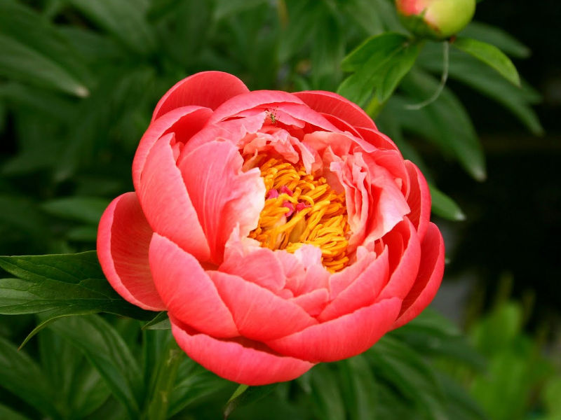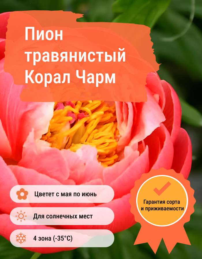 Рассада пиона молочноцветкового Корал Чарм (Coral Charm) представляет собой прекрасное садовое растение, которое привлекает внимание густыми кустами и нежными бутонами. Цветок довольно крупный, полумахровый, с несколькими рядами лепестков кораллово-розовых лепестков. Серединку бутона украшают многочисленные рыжие тычинки.