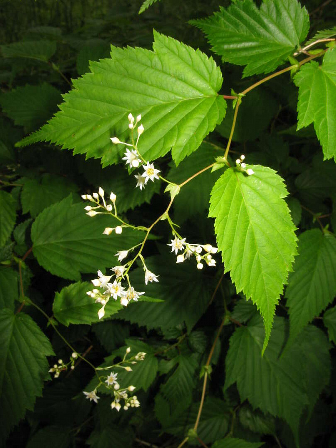 Саженцы стефанандры Танаки подарят саду высокорослый раскидистый кустарник с изящными листьями и воздушной кроной. Именно форма листьев и составляет основную декоративность кустарника. Основание листочка сердцевидное, а конец сильно заостренный, края крупнозубчатые.