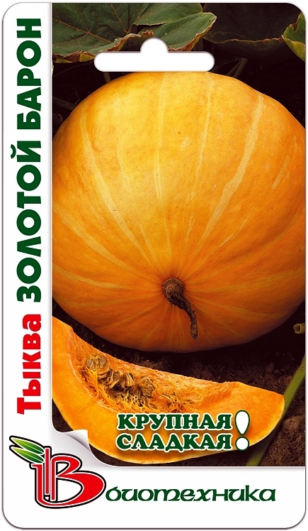 Семена тыквы "Золотой Барон" (Zolotoj Baron) позволяют выращивать на огороде очень крупные оранжевые плоды. Сорт среднеспелый. От массовых всходов до сбора урожая проходит около 98-110 дней. Тыквы получаются округлой формы, с гладкой кожицей золотисто-оранжевого цвета. Мякоть плодов плотная, ярко-оранжевая, обладает очень приятным и нежным ароматом. Средняя масса одной тыквы может достигать 8-10 кг. Урожай рекомендован к употреблению в свежем виде, а также для приготовления различных блюд: цукатов, сока, каш, печенных и так далее. Плоды могут храниться до следующего года.