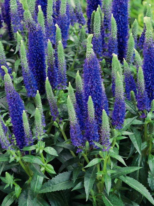 Рассада вероники колосистая Алстер Дварф Блю (змеиная трава Veronica spicata) отлично себя чувствует на любых почвах и переносит даже сильные зимние морозы без укрытия. Взрослый куст достаточно декоративен, особенно во время цветения. Насыщенно-синие, колосовидные соцветия украшают растение 35-40 дней с середины июня по конец июля. После отцветания, колоски срезают, чтобы заново отрасли зеленые побеги. Высота культуры около 30-40 см. Компактные размеры и высокая декоративность делает веронику колосистую Алстер Дварф Блю незаменимой в миксбордерах и рокариях.