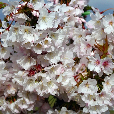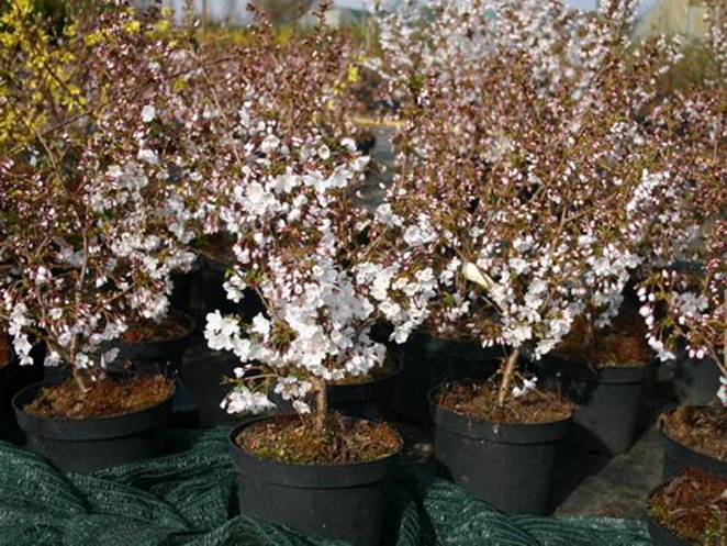Саженцы Вишни ниппонской Бриллант (Brillant, Prunus nipponica) – это кустарник, который относится к декоративным растением. Цветение вишни продолжается около месяца с апреля по май. Обычно кустарник вырастает до 3-4х метров в высоту. Растение описывается, как красивое густо и медленнорастущее. Вишня ниппонской Бриллант имеет листья с формой, похожей на овал, которые летние месяцы имеют темно-зеленый цвета, а осенью они становятся ярко-красными. По среди лета на вишне созревают небольшие плоды черного цвета, которые относят к съедобным. Особенно красиво выглядит растение, когда посажено у берегов водоемов или образует живые аллеи.